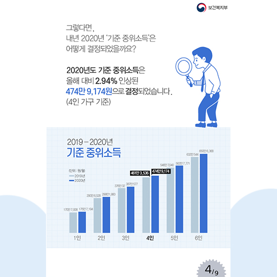| 47%(주거급여) | 976,609원 | 1,624,393원 | 2,084,364원 | 2,538,453원 | 2,975,423원 | 3,397,151원 | 3,810,532원 |