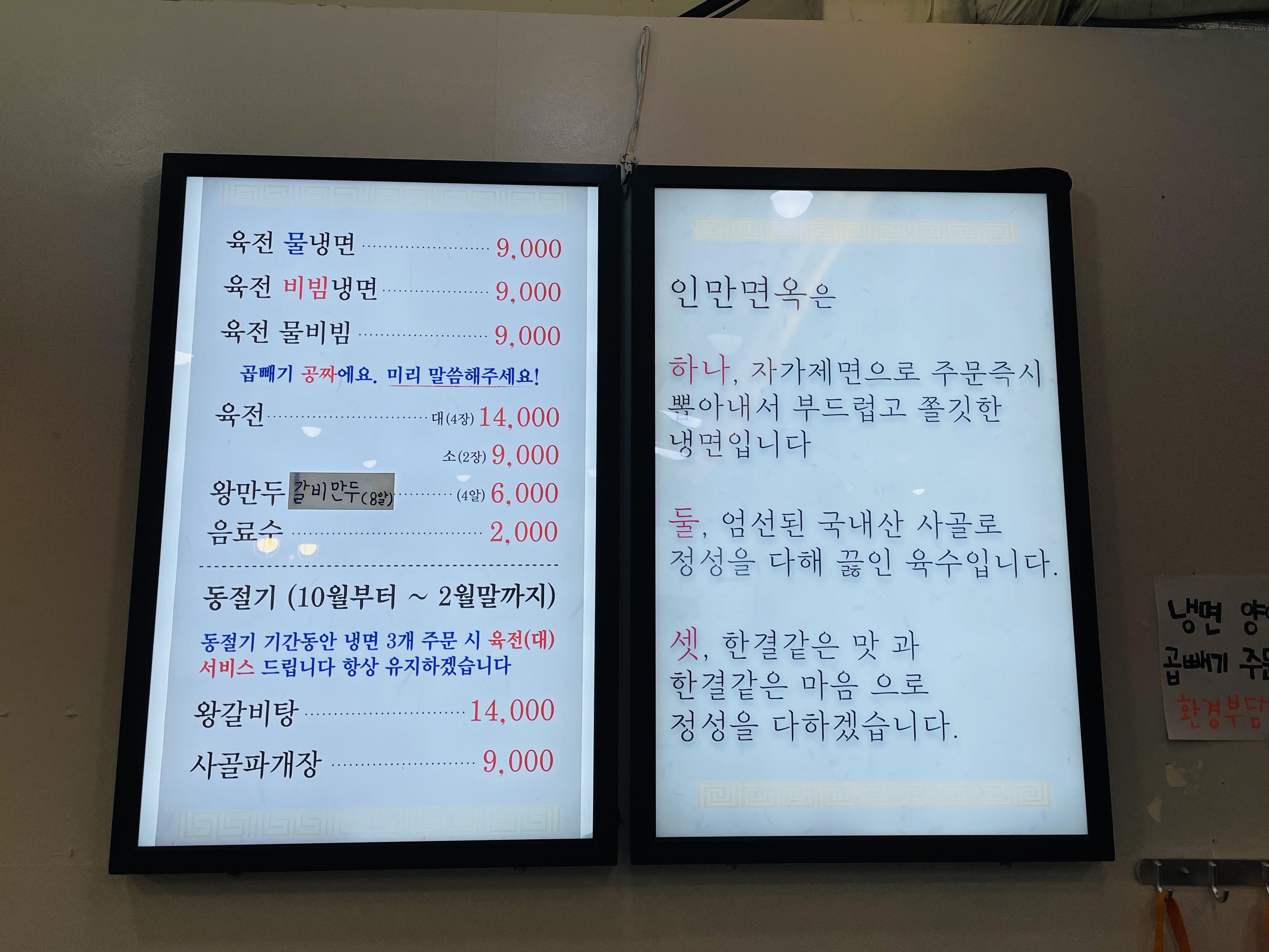 메뉴는 단출했다. 우리는 육전물냉면과 육전비빔냉면을 주문했다. 만두도 시킬까 하다가 양이 많다는 후기를 봤기에 일단 냉면 두 그릇만 주문했다.