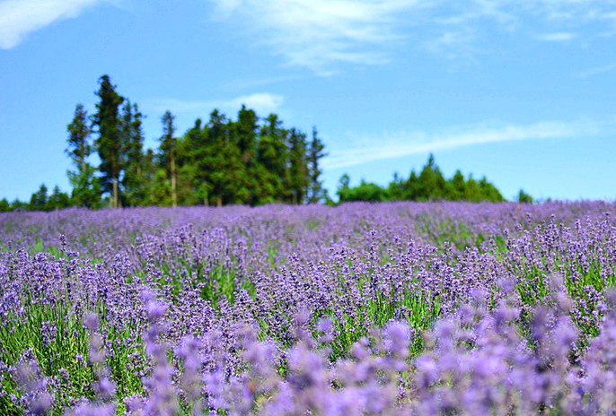 보라색의 물결이 산과 하늘과 어우러져서 시선을 사로잡습니다.