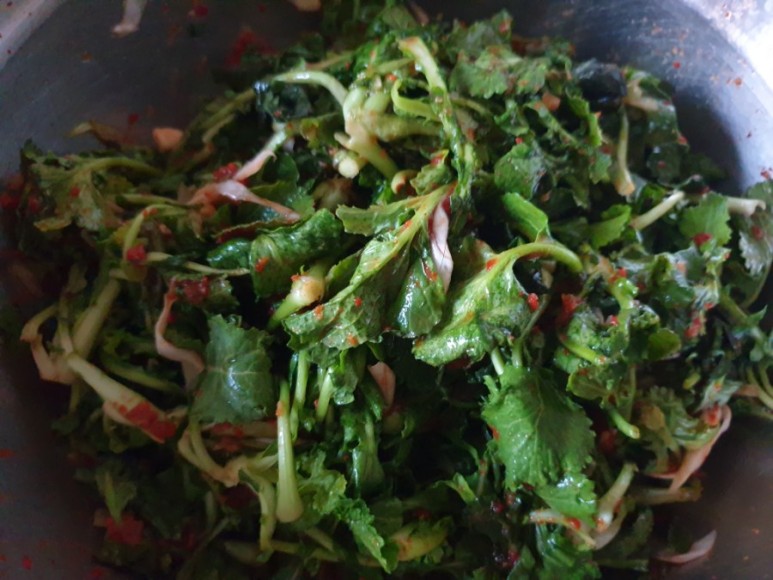 4.양념장에 참기름을 넣고 섞은 후 월동초와 함께 버무려준다.