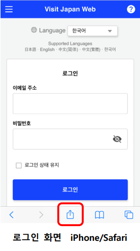 ‘로그인 화면 아이폰 /사파리’에서 붉은 테두리 안의 아이콘을 탭하여 ‘옵션 화면 아이폰/사파리’를 표시합니다.