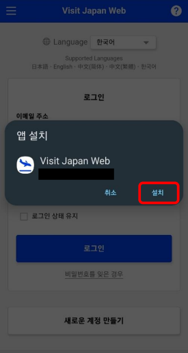 화면에 표시되는 팝업에서 '설치'를 탭하여 오프라인 이용에 필요한 앱을 설치합니다