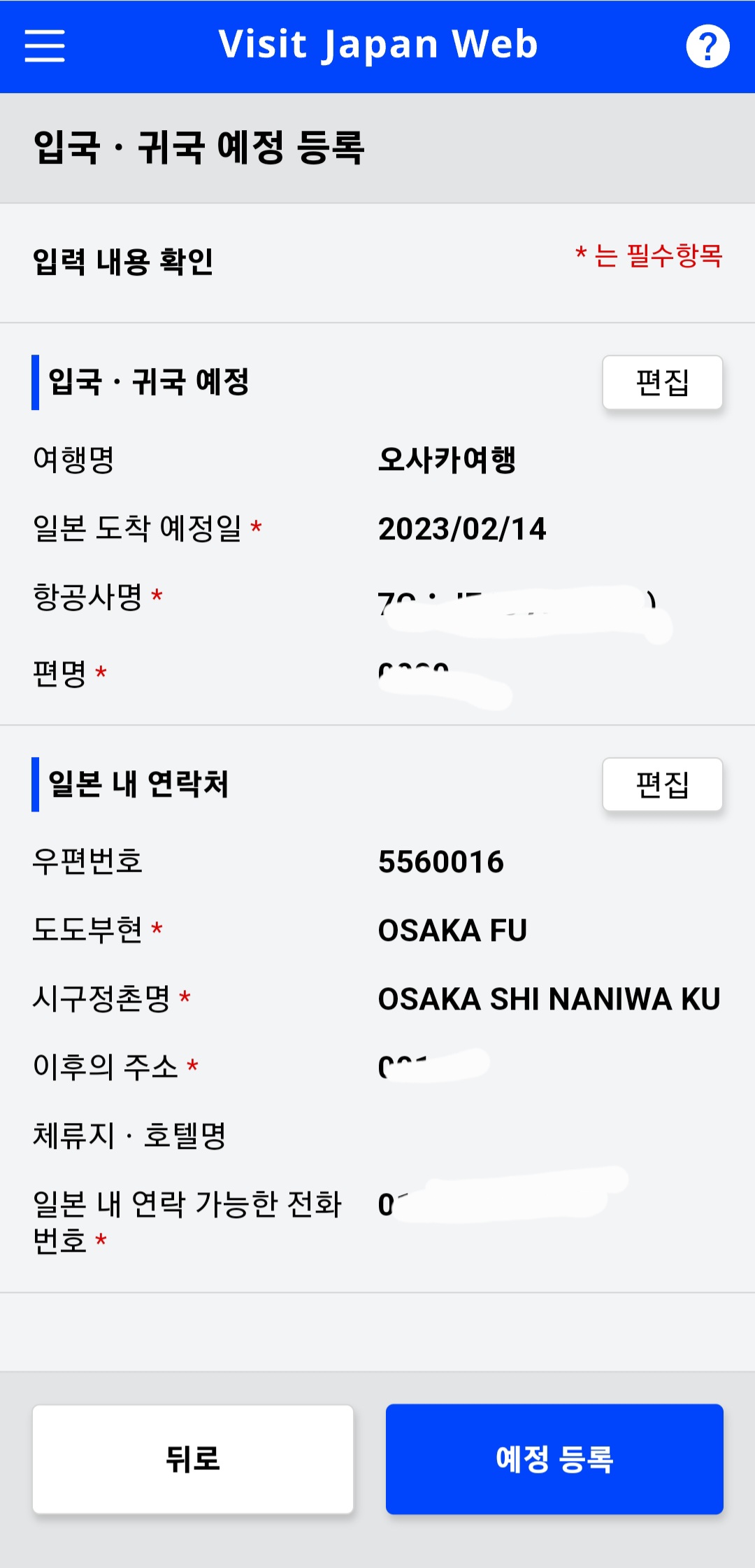 일본 도착일, 항공 편명, 숙소 정보 등록
