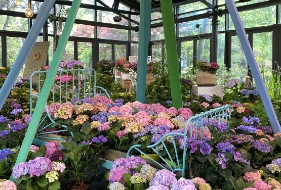 식물원에서는 화분에 담긴 알록달록한 수국들을 보고, 카페에서는 시원한 음료를 마시며 휴식을 취할 수 있습니다.