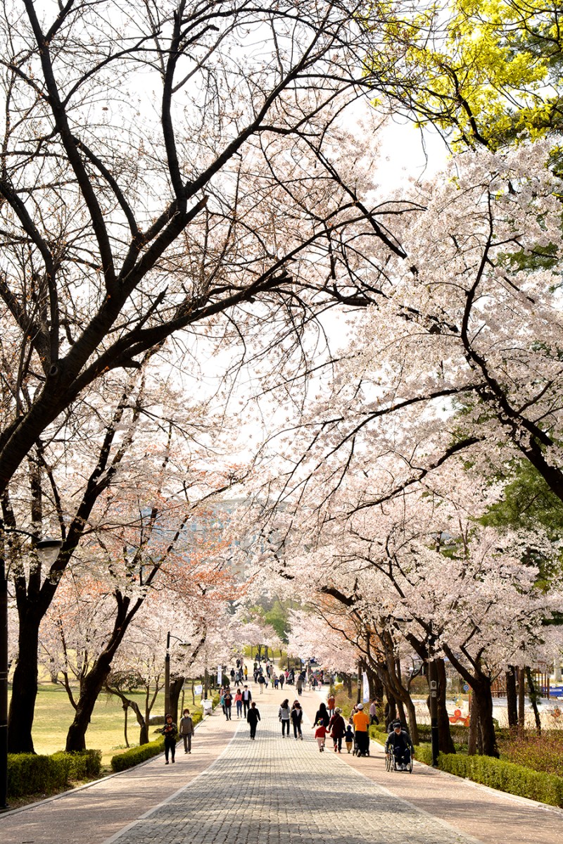 -올림픽공원은 송파구 방이동에 있는 역사와 문화가 공존하는 공간으로, 한국 최대규모의 벚꽃축제가 열립니다. 일반적인 왕벚나무뿐 아니라 흰색과 분홍색의 복합벚꽃도 볼 수 있습니다.
