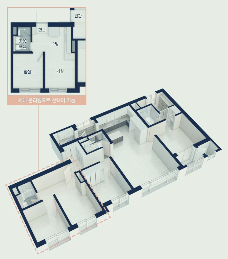 세대 구분형 아파트는 한 집에 두 가구가 살 수 있도록 현관과 내부공간을 분리하고, 별도의 출입문과 계량기를 설치한 구조로, 한 지붕 두 가족 형태의 평면구성을 말합니다.
