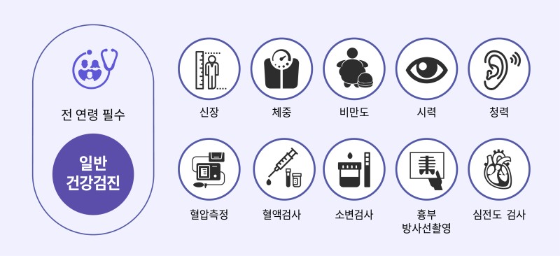 건강 검진은 혈압, 혈당, 콜레스테롤, 간 기능, 신장 기능, 갑상선 기능, 골밀도, 시력, 청력 등 다양한 검사와 선별 검사를 포함하여 부모님의 신체적, 정신적 건강을 종합적으로 검사하는 검사입니다.