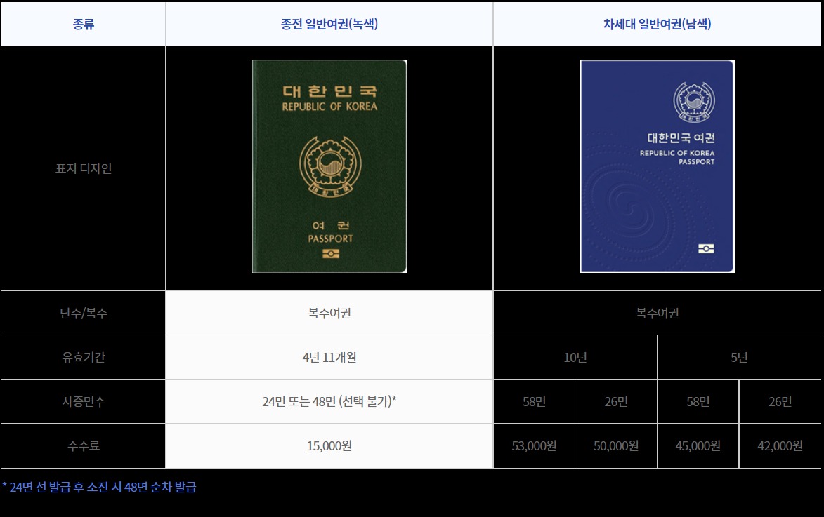 유효기간 10년기준 / 24면 여권 50,000원, 48면 53,000원이고 5년 기준 24면 42,000원 , 48면 45,000원입니다.