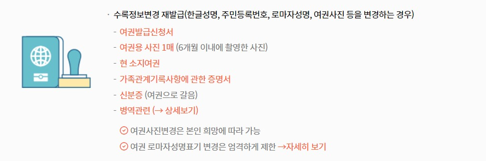 수록정보변경(한글성명, 주민등록번호, 로마자성명, 여권사진 등의 변경)으로 재발급이 필요한 경우