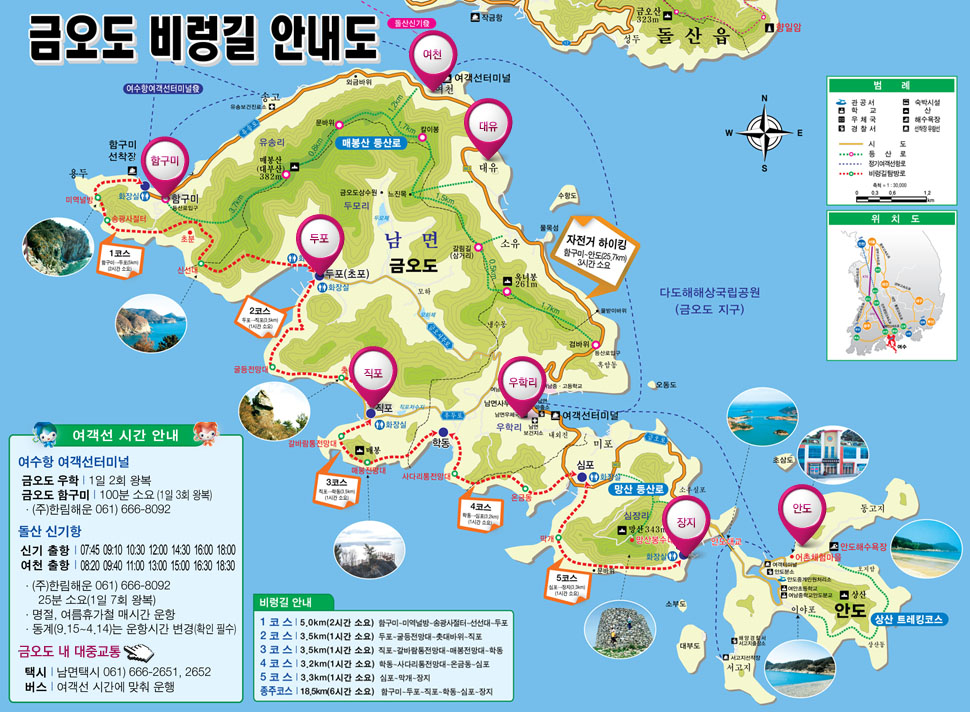 금오도 비렁길은 바다색과 동백나무가 조화롭게 어울리며, 주변에는 낚시터와 편의점 등이 있어 편하게 즐길 수 있습니다.