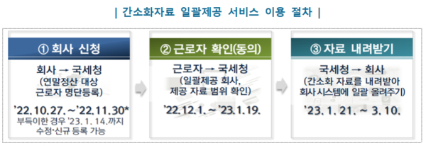 근로자는 우선 2022년 12월 1일부터 2023년 1월 19일까지 홈택스에서 일괄 제공되는 회사 및 자료 범위를 확인(동의) 해야 합니다.