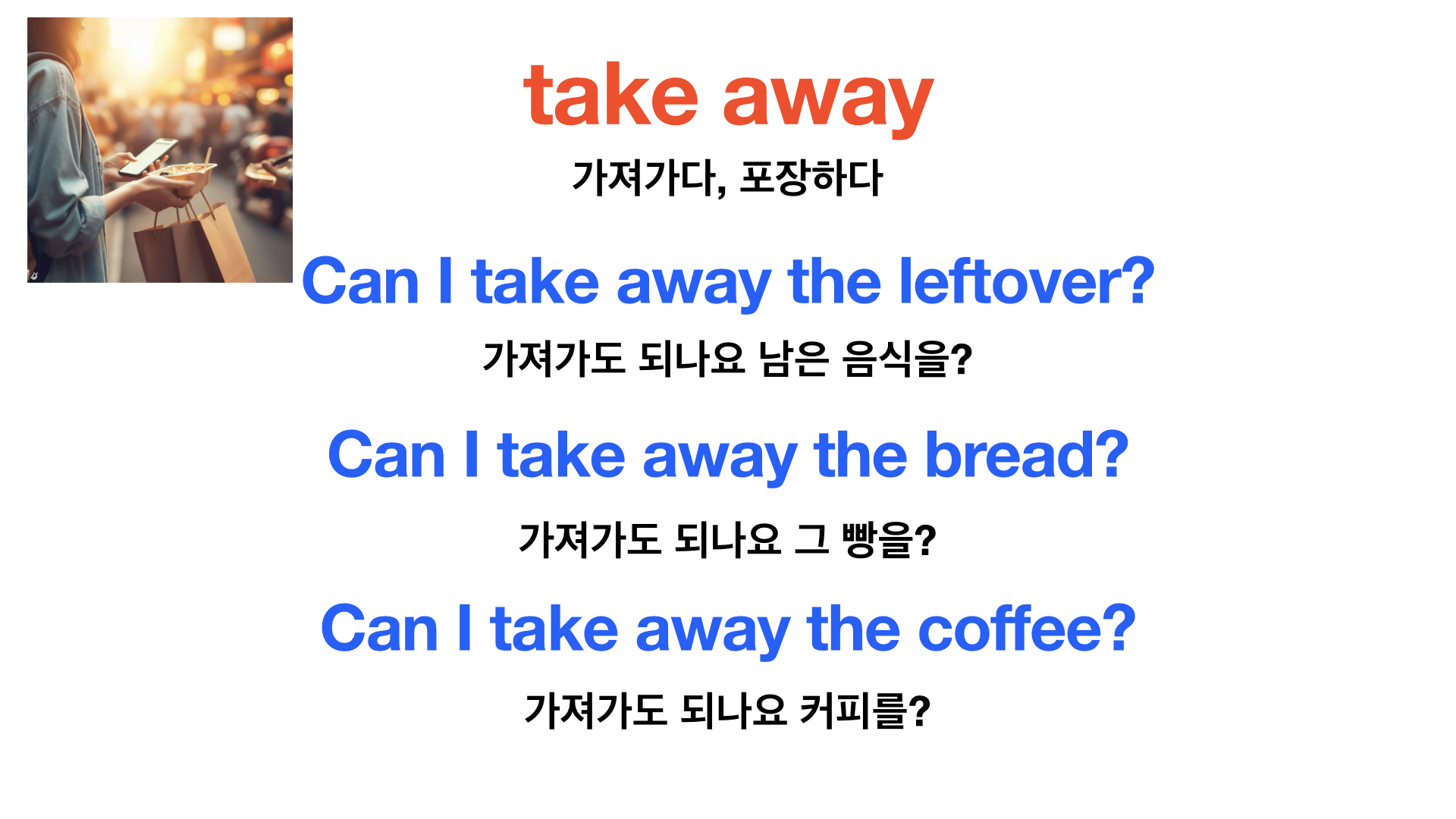 예) Can I take away the leftovers? 남은 음식을 가져갈 수 있나요?