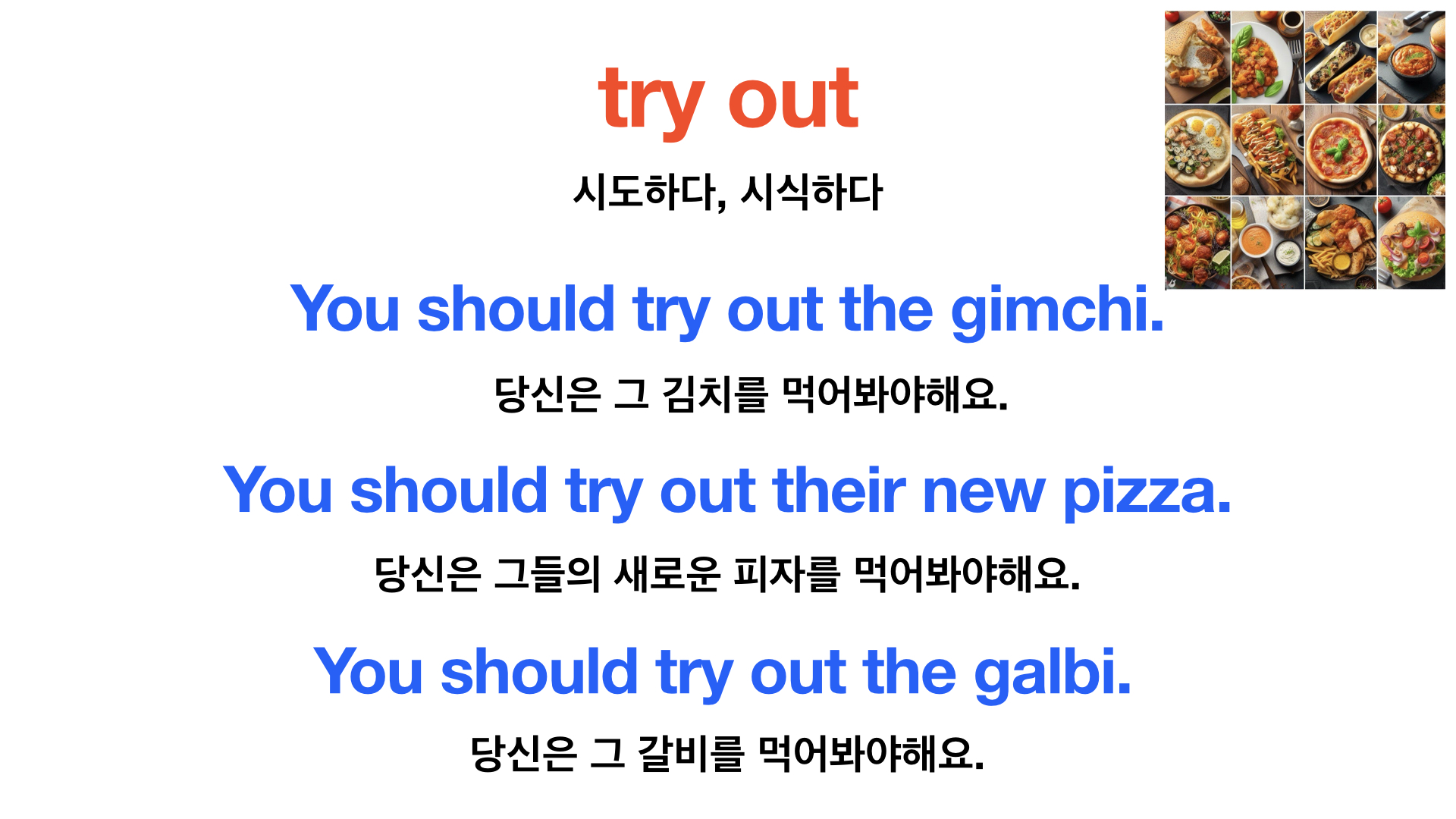 - try out something: ~을 시도하다, 시식하다.