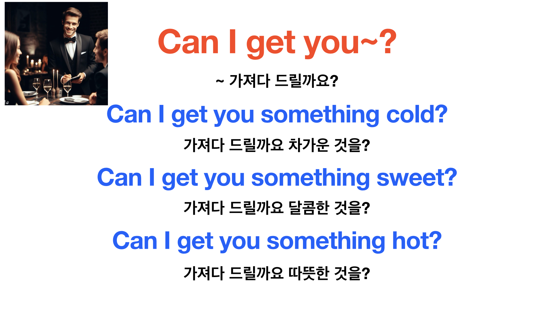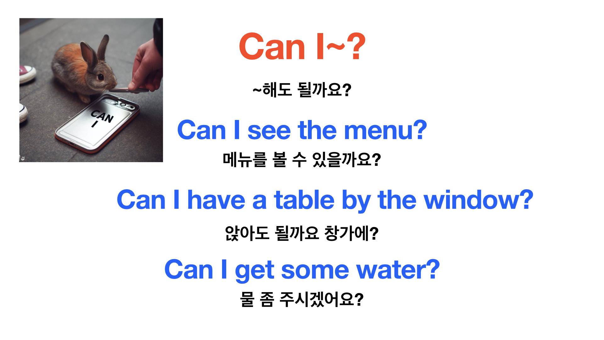 예) Can I ask for more water, please? 물 좀 더 주실 수 있나요?