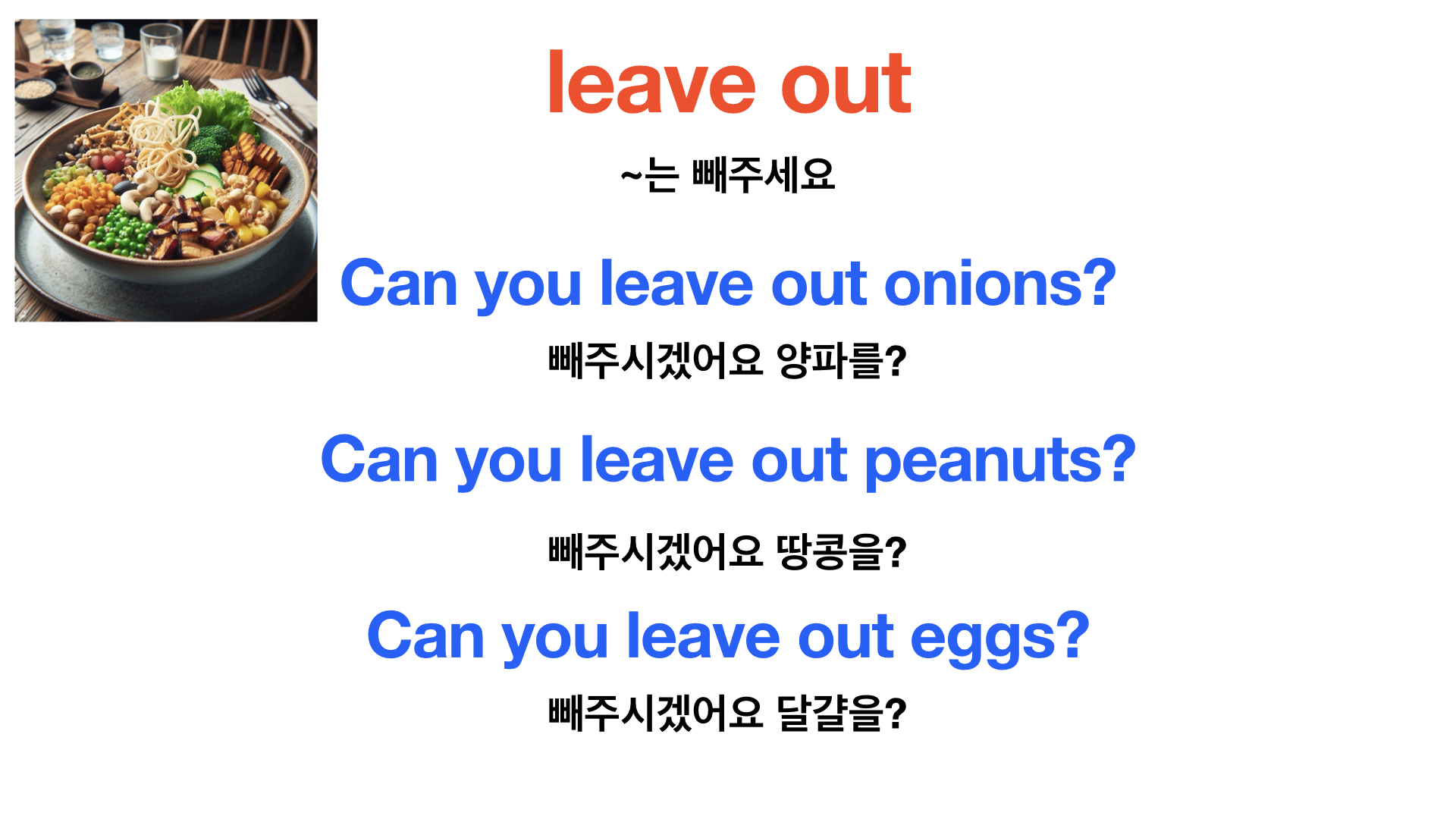 예) Can you leave out the onions? I'm allergic to them. 양파는 빼 주실 수 있나요? 나는 양파 알레르기가 있어요.