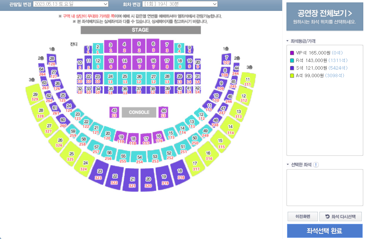 서울 공연은 5월 13일 1회 차 19시 30분 공연만 있으므로 좌석선택을 클릭하시면 바로 예매가 진행됩니다.