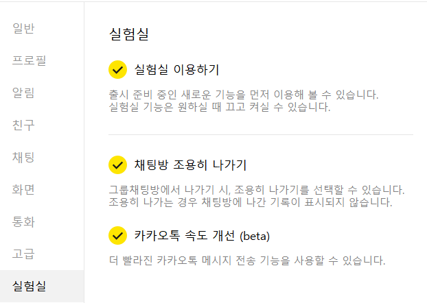 5. 실험실 이용하기를 활성화하면, 하단에 여러 기능들이 나타납니다. 여기서 채팅방 조용히 나가기를 체크합니다.
