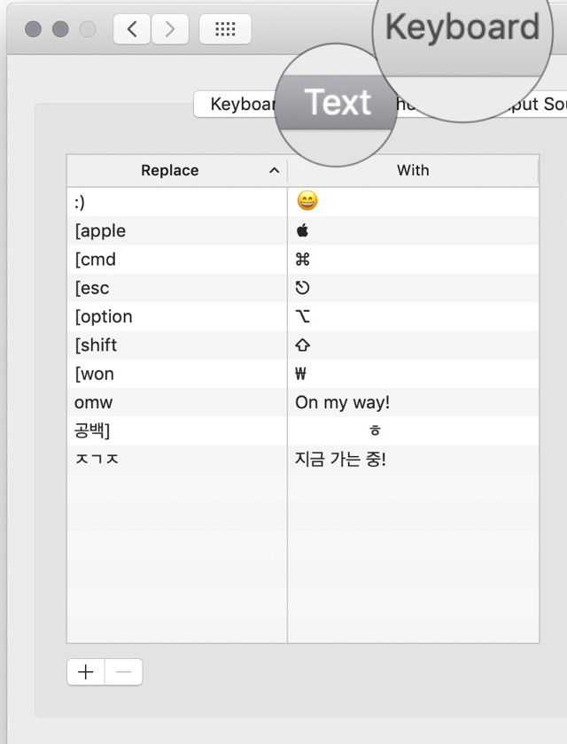 위와 같은 방식으로 텍스트 대치를 등록해두게 되면 이렇게 텍스트 대치들이 저장되게 됩니다.