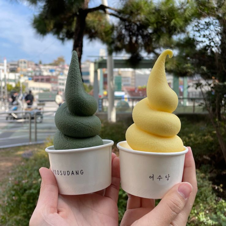 쑥아이스크림은 쑥의 향과 색깔이 잘 살아있는 아이스크림으로, 여수의 특산물인 국화꿀을 듬뿍 넣어 만든 곳입니다.