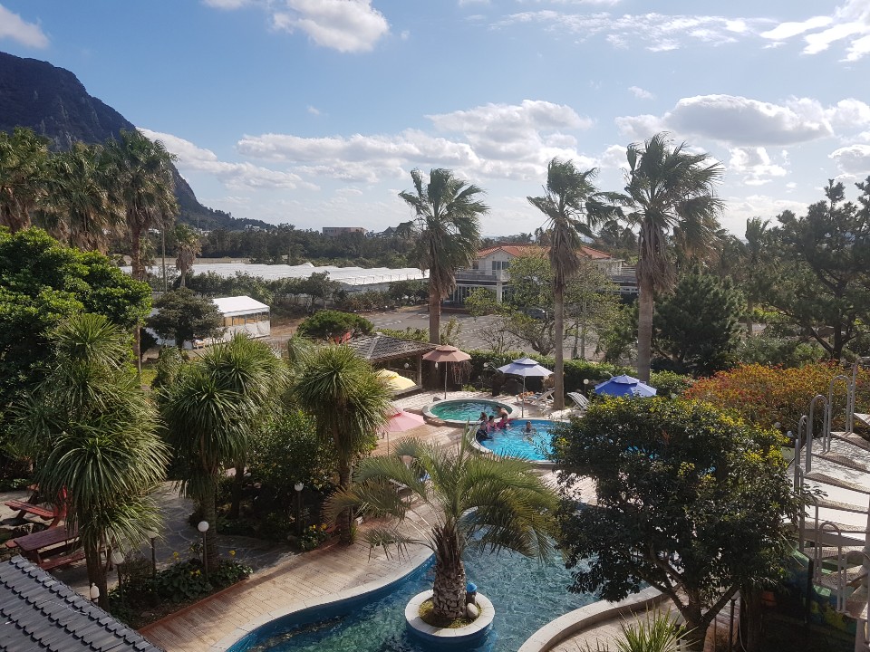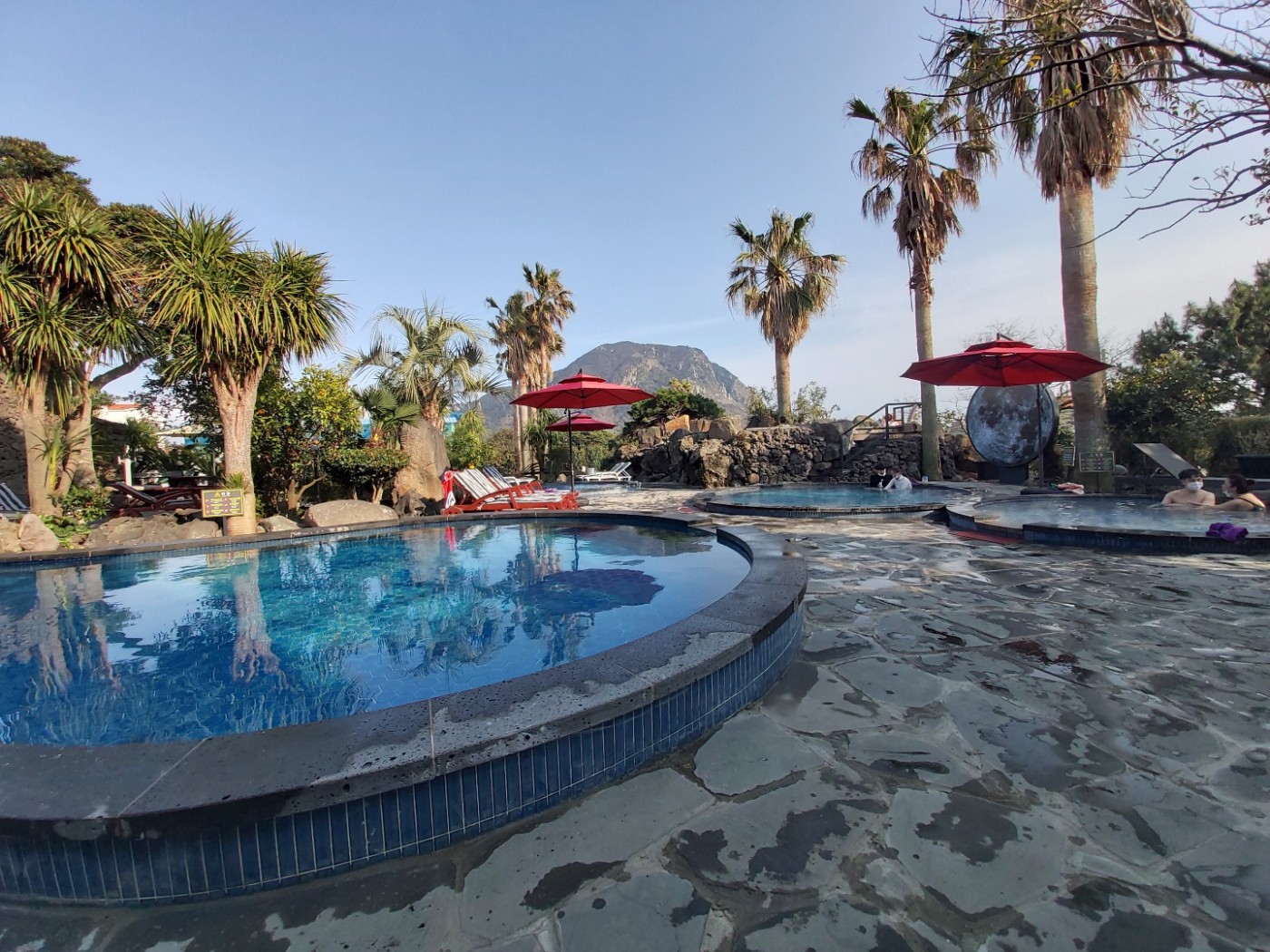 노천탕 주변으로 야자수가 조경수로 심겨져있어 무척 이국적이면서도 제주 산방산을 조망할 수 있어 더욱 특별합니다.