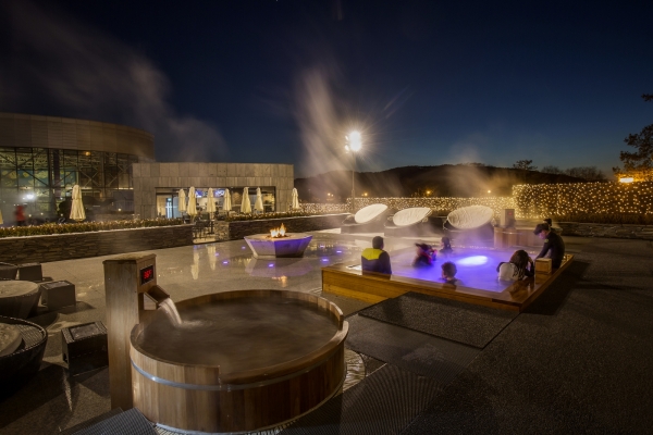 설악워터피아의 또다른 매력 중 하나는 전 세계 유명 온천들을 모티브로 하여 총 16개의 탕으로 구성된 설악워터피아만의 특별한 야외 온천 시설인 스파밸리입니다.