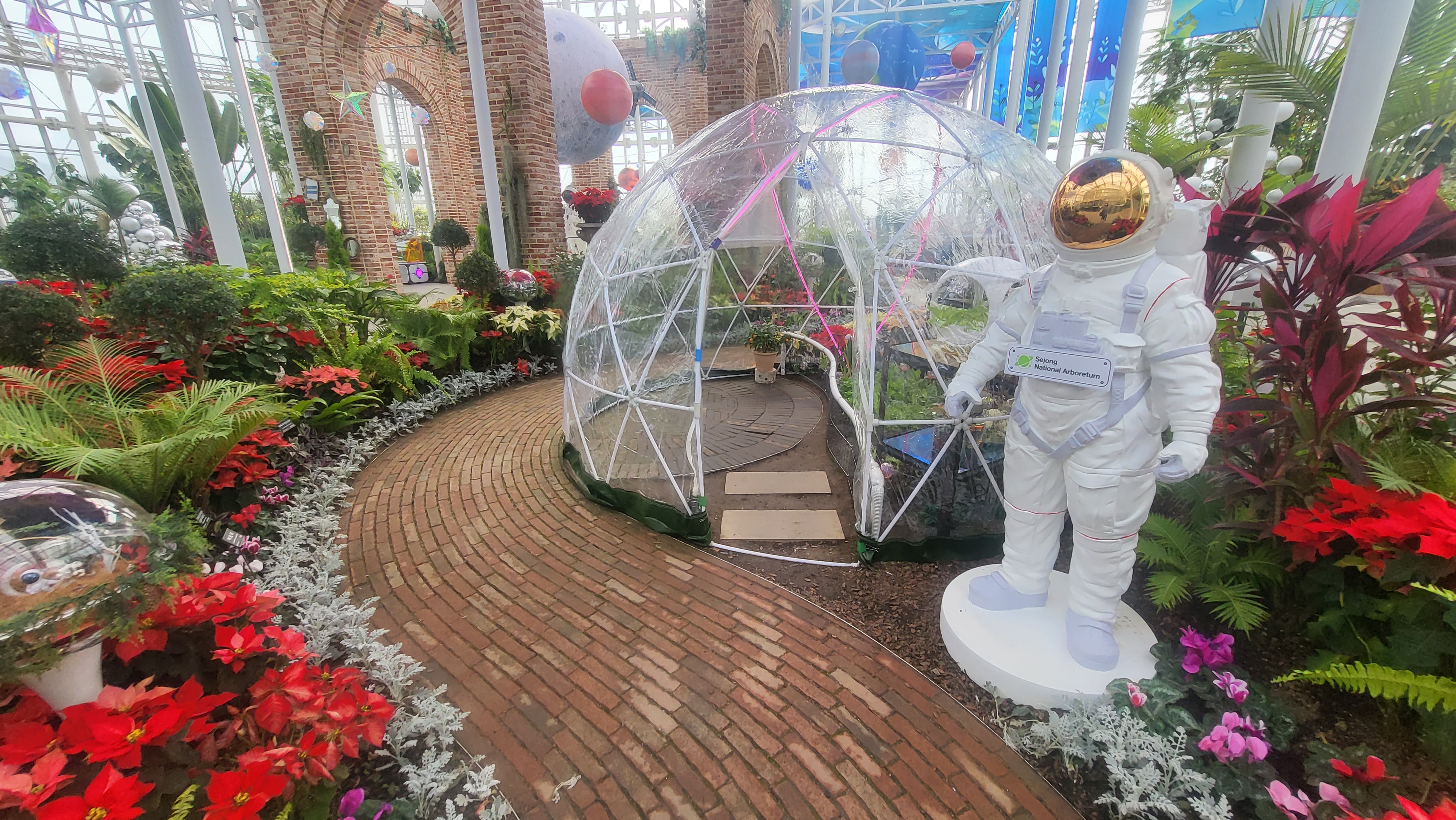 우주의 풍경과 당 탐사 장면을 연출하고 미국항공우주국에서 연구한 공기정화식물에 대한 정보를 알림을 목적으로 하는 전시입니다. 포인세티어 꽃이 더욱 크리스마스를 느끼게 하는 따뜻하고 예쁜 정원입니다.