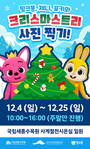 국립세종 수목원은 핑크퐁과 크리스마스트리와 함께 정말 즐거운 크리스마스 분위기를 연출하고 있습니다.