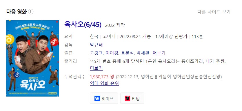 | 1월 24일 화요일 | 20 : 20 | 육사오(6/45) | 12세 관람가 |