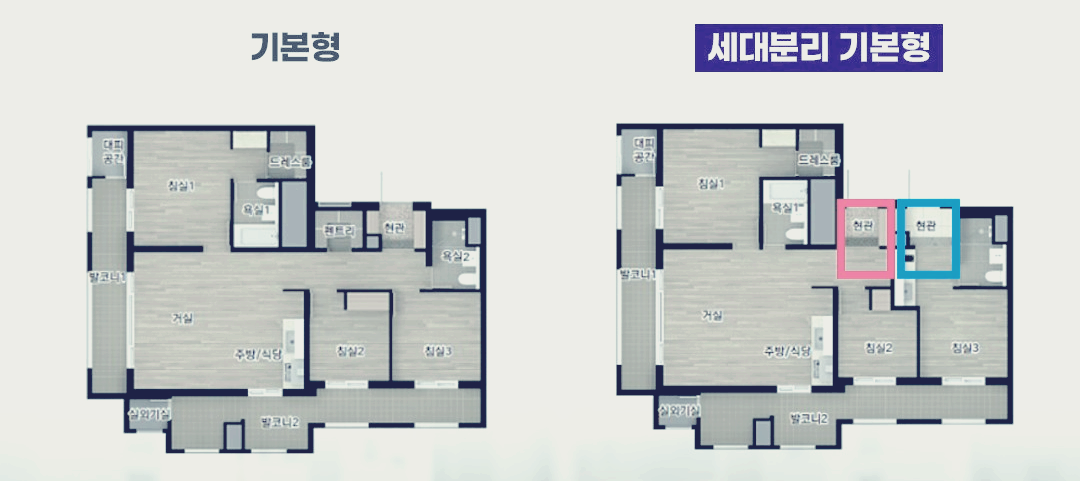 세대 구분형 아파트는 한 집에 두 가구가 살 수 있도록 현관과 내부공간을 분리하고, 별도의 출입문과 계량기를 설치한 구조로, 한 지붕 두 가족 형태의 평면구성을 말합니다.