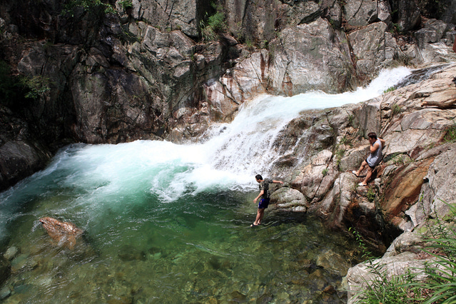 야영장 옆 계곡뿐 아니라 물이 모인 곳곳에 놀기 좋은 물놀이장이 있습니다. 텐트 철수하고 계곡에 한번, 유안청 폭포 다녀오고 또 계곡, 매점에서 음료수 사 먹고 또 계곡.
