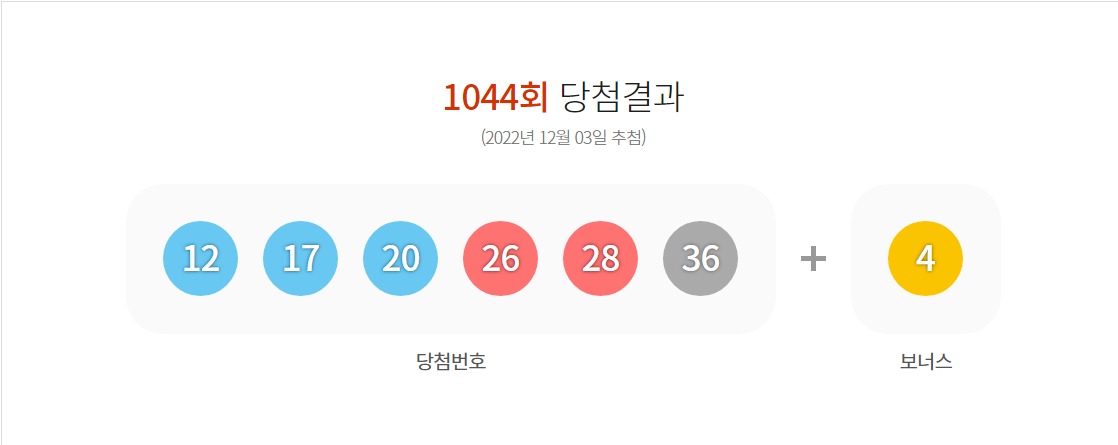 제1044회 로또 6/45 동행복권 추첨 결과 '12, 17, 20, 26, 28, 36'이 1등 당첨번호로 결정됐습니다.