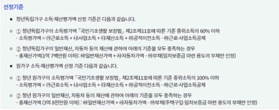 ●청년가구뿐 아니라 청년과 부모를 포함한 원가구의 소득. 재산이 모두 일정 기준을 충족해야 합니다.