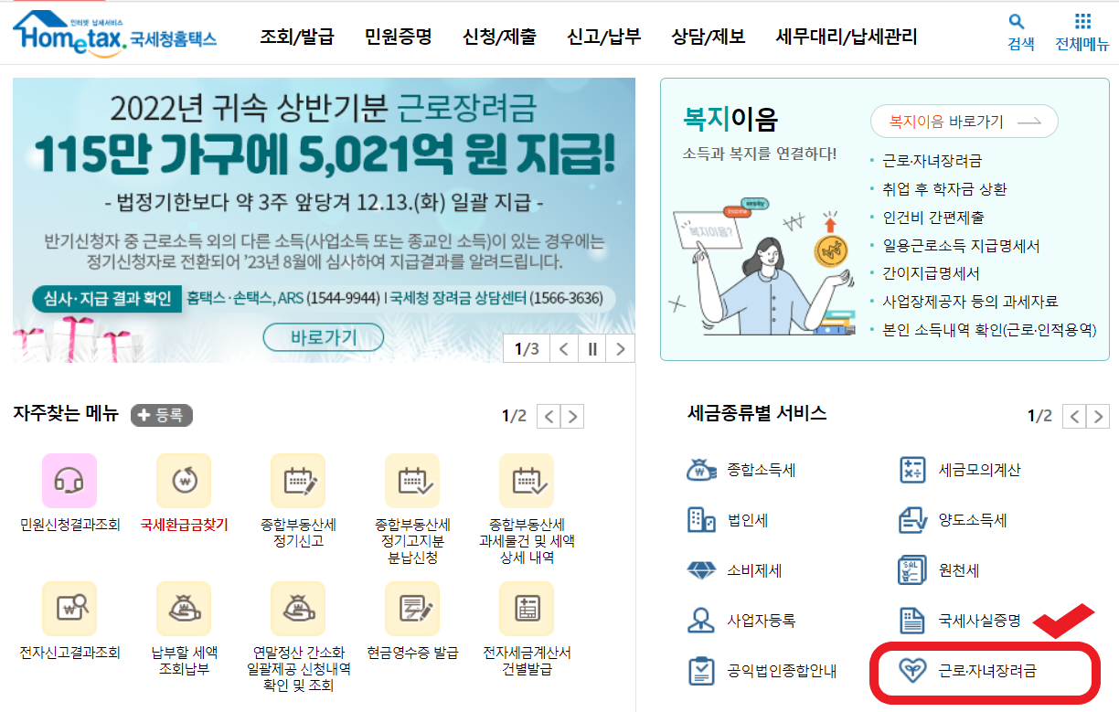 국세청 홈택스 로그인 후 반기 근로장려금 신청하세요
